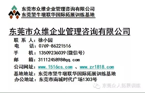 如果你有興趣,想進(jìn)一步了解眾維企管&眾人團(tuán)隊?請來電0769-86221516,13509236039、13829164416或QQ3111245898咨詢。(東莞拓展培訓(xùn)-眾維培訓(xùn)公司網(wǎng)址:m.surveymechanic.com、www.zr1818.com)。